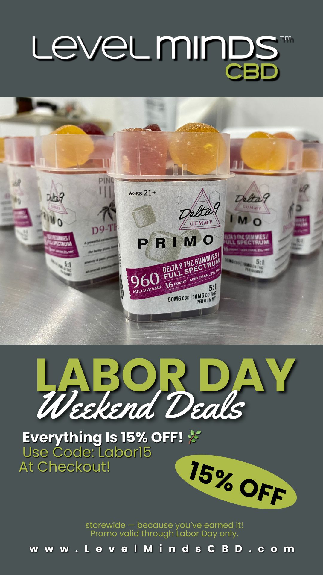 Stop by our Suwanee location or shop online at www.LevelMindsCBD.com and use promo code Labor15 at checkout. 🌿💚